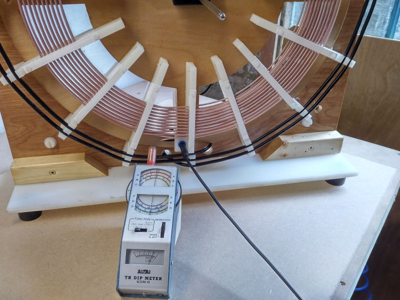 For dip meter measurements a 180cm lead was added to the outer or bottom-end coil terminal in order to lower the impedance sufficiently for λ/4 measurements. As the dial of the dip-meter is not a very accurate scale the oscillator setting was checked for frequency using the Tektronix 7L5 spectrum analyser with a small pick-up antenna.