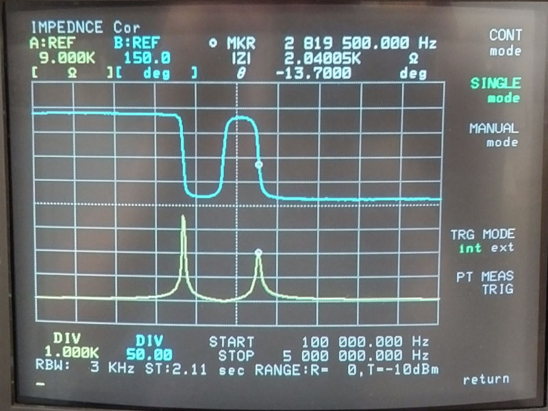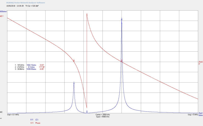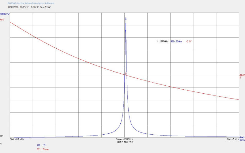 Fig 5.2. Increasing CP=750pF as per the measurement in Fig., 2.5. the 1P primary resonant frequency has moved to 2239.25kc/s, and was previously measured as 2233kc/s by the VNA-SDR showing < 0.5% variation in the frequency. |Z| measures as 8.02kΩ, and was previously 9.072kΩ showing ~12% variation. FØ180 measures as 11000kc/s and was previously 11744kc/s ~7% variation.