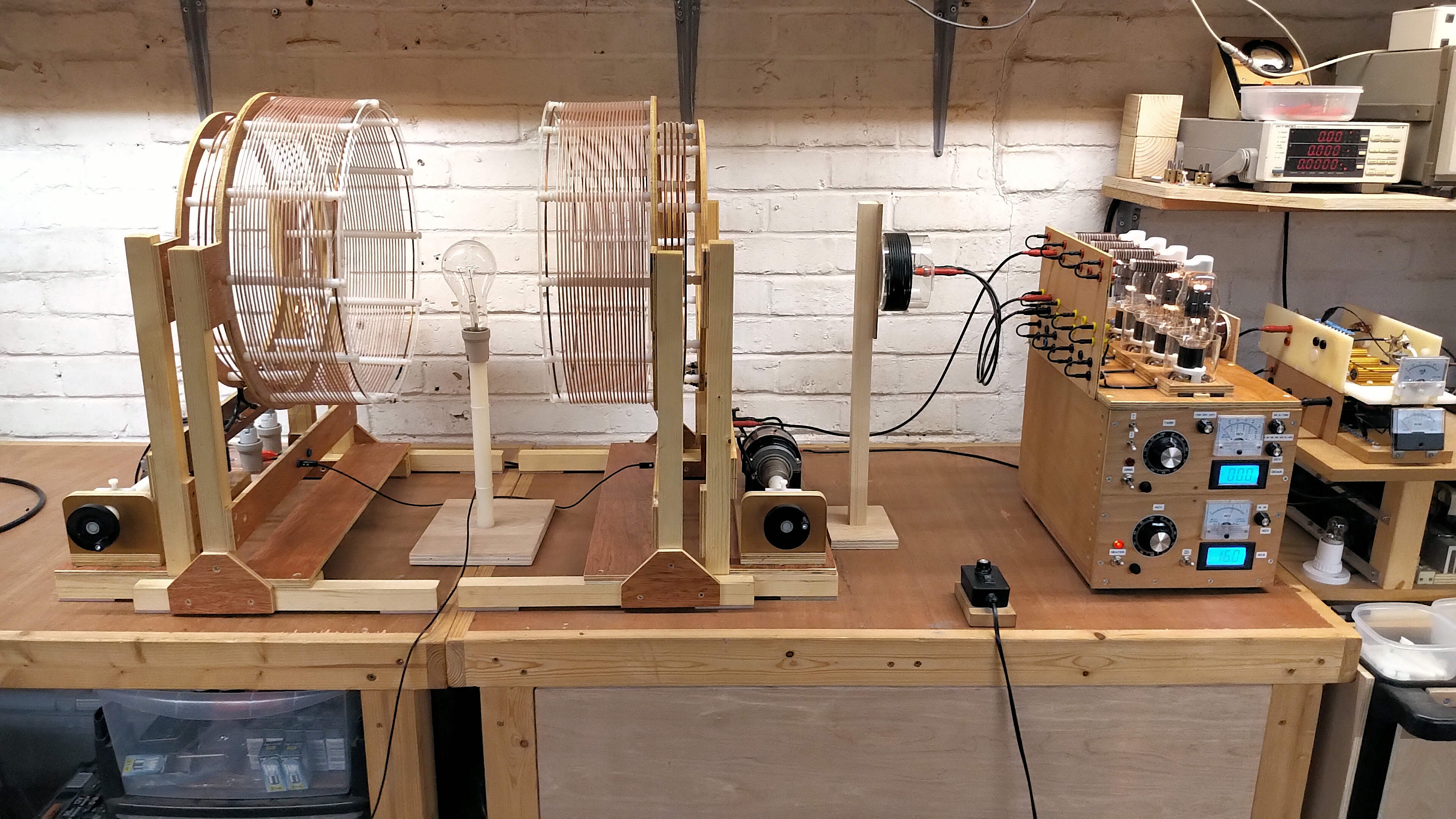 This cylindrical coil was designed to be suitable for plasma experiments including induction generator arrangements, transference of electric power, and as a suitable induction pump for various extra coil configurations. The secondary coil was intended to have its fundamental resonant frequency, the lower frequency when coupled with the primary coil, in the 160m amateur band between 1.8-2.0Mc, and the upper frequency as close to, or tunable into, the 80m amateur band at 3.5-4.0Mc. For induction generator experiments it was decided to keep the diameter of the secondary coil close to that originally designed by Dollard.