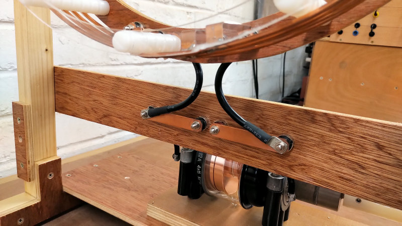 The primary design was intended to fully fit inside the secondary for maximum coupling experiments, reducing the outer diameter of the primary to 390mm. This does introduce a distortion in the magnetic field of induction as compared with a primary the same diameter as the secondary, and standing-off a physical distance below the secondary bottom-end winding. For the intended experiments the primary was set as a fixed 4 turns of  1/8” copper tube on a turn period of 9mm, and which have 4 fixed taps, and of course a variable tap can be used on the bare copper tube for very accurate tuning adjustments if needed. The fixed taps allow the primary coil to be electrically varied between 1 and 4 turns.
